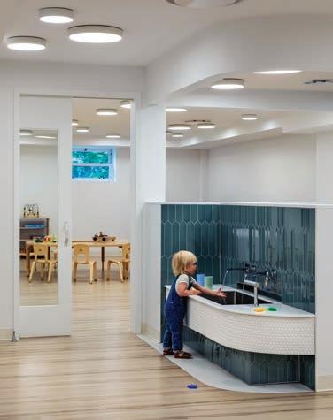 by painting the roof-level atrium covering a rich sky-blue hue. Then she used luminaires in an inventive way to further animate the ceiling plane. From this surface, Barker suspended two dozen fixtures with white shades in variety of organic shapes. During the day, they can represent clouds to the children. On days when it becomes dark in the late afternoon, they can appear as stars to add sparkle to the setting. Constructed during the pandemic, Barker made some COVID-related tweaks to the design of this educational space. “The pandemic prompted some ventilation improvements in the form of electronic and ultraviolet light, HVAC filters, touchless security and check in points, as well as the addition of operable windows to bring light and air to all classrooms,” she said.