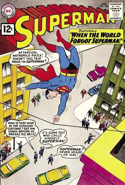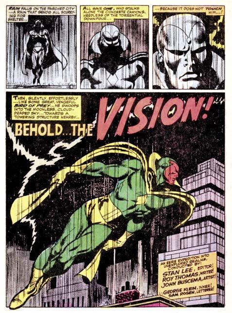 If George had returned to Marvel Comics a couple of years earlier, no doubt editor Stan Lee’s cavortin’ credits would’ve dubbed him “Gorgeous George” (after a prominent 1950s wrestler)—and maybe they did, somewhere. Above photo courtesy of Todd Klein (no relation, far as we know.) Also on this page are a trio of counterclockwise highlights of Klein’s post-Timely career: The first Superman cover inked by Klein—for #150 (Jan. 1962), over pencils by Curt Swan, who was then fast becoming the Man of Steel’s major delineator. Thanks to the Grand Comics Database. [TM & © DC Comics.] The splash page of the second chapter in Fantastic Four #1 (Nov. 1961)—probably done within a few weeks of the Superman #150 cover—was evidently inked by GK over pencils by Jack Kirby. Script by Stan Lee. Thanks to Jim Kealy. Since George’s first assignment at late-’60s Marvel was The Avengers #55, he was on hand to lend his considerable embellishing skills to John Buscema’s dynamic pencils for #57 (Oct. ’68), which introduced the Marvel Age Vision. Script by Roy Thomas. Thanks to Bob Bailey. [FF & Avengers pages TM & © Marvel Characters, Inc.]