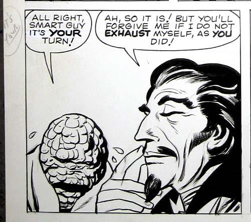 Next up for study is page 3. Panel 6 has a margin note by Lee to alter two words in the Thing’s speech balloon to: “It’s YOUR,” perhaps from his original, more formal “It is YOUR.” The crudely lettered correction was clearly not the work of Artie Simek. Lee was a stickler for getting a character’s speech just right (as observed on many original art pages over the years), and this might be the case here. Also, the bold lettering could have been added for emphasis. The Thing’s face has touch-ups in this frame, likely by inker Sol Brodsky, where beads of sweat appear to have been hastily added,