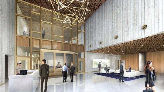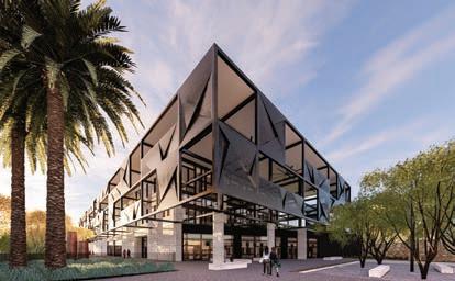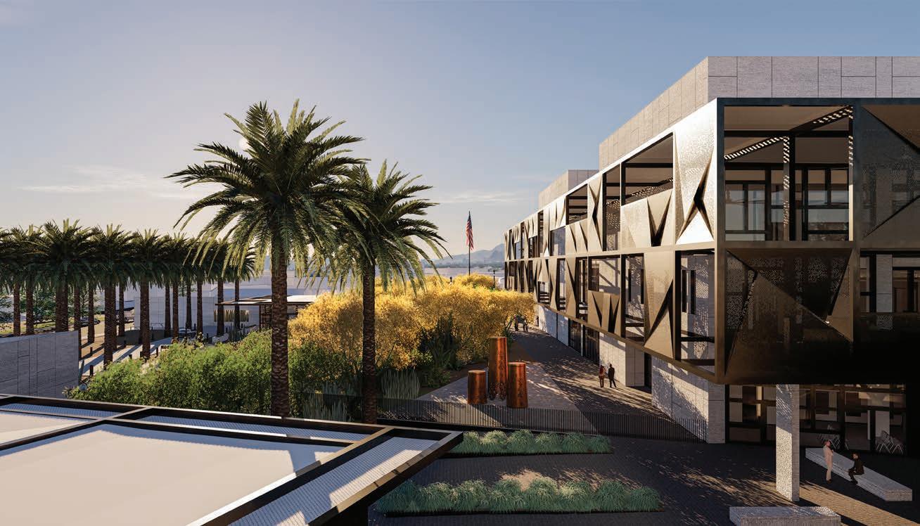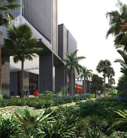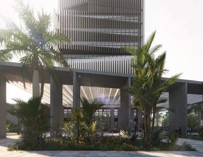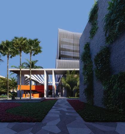 The project is aiming for U.S. Green Building Council LEED Silver certification and projecting an energy performance that is 32% below the ashrae 90.1 baseline. Photovoltaic canopies and chilled beam systems will be employed, and the building envelope’s brise-soleil (of vertical perforated aluminum fins) is predicted to reduce solar heat gain on the glazed faces by 44%. To conserve water, stormwater will be captured, treated onsite, and used for landscape irrigation, water features, and cooling towers. Low-flow plumbing fixtures are also being installed.