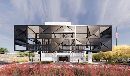 The Consulate’s signature design element reimagined the balcony and shading element in conventional Mexican architecture. A twostory external façade armature clad in patinated zinc is a striking contrast against the white precast building encased within it. The steel structure and perforated metal sunshade: