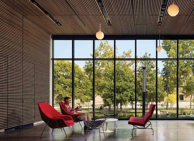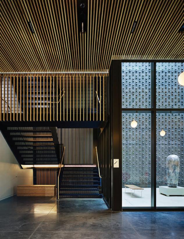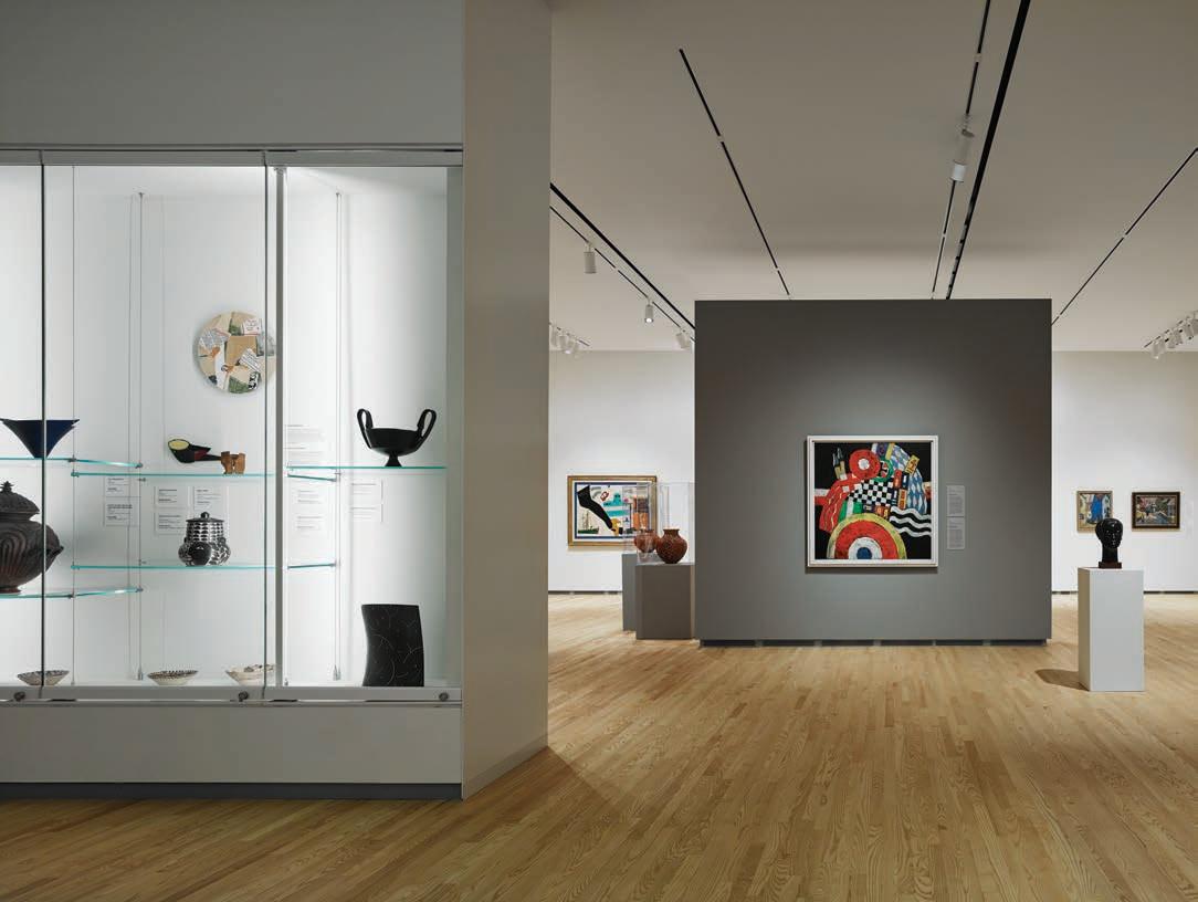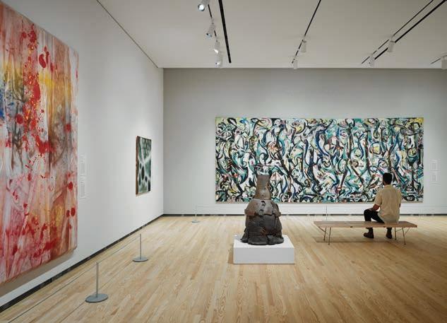 Lighting decisions were scrutinized for their energy use, aesthetics, and potential impact on the conservation of art, especially natural light. “As architects, one of the first tools we start to use to articulate a building is glazed fenestration,” explains Nagle. The design limited windows on the second floor, relying on the threestory lightwell that separates the gallery space into two halves and hugs the stairwell from the lobby on up. “The stair acts as a baffle to reduce the amount of UV penetration that filters into the entrance component of that gallery level,” she says. The lightwell and its natural light also help orient visitors when they’re viewing art in the second-floor galleries.