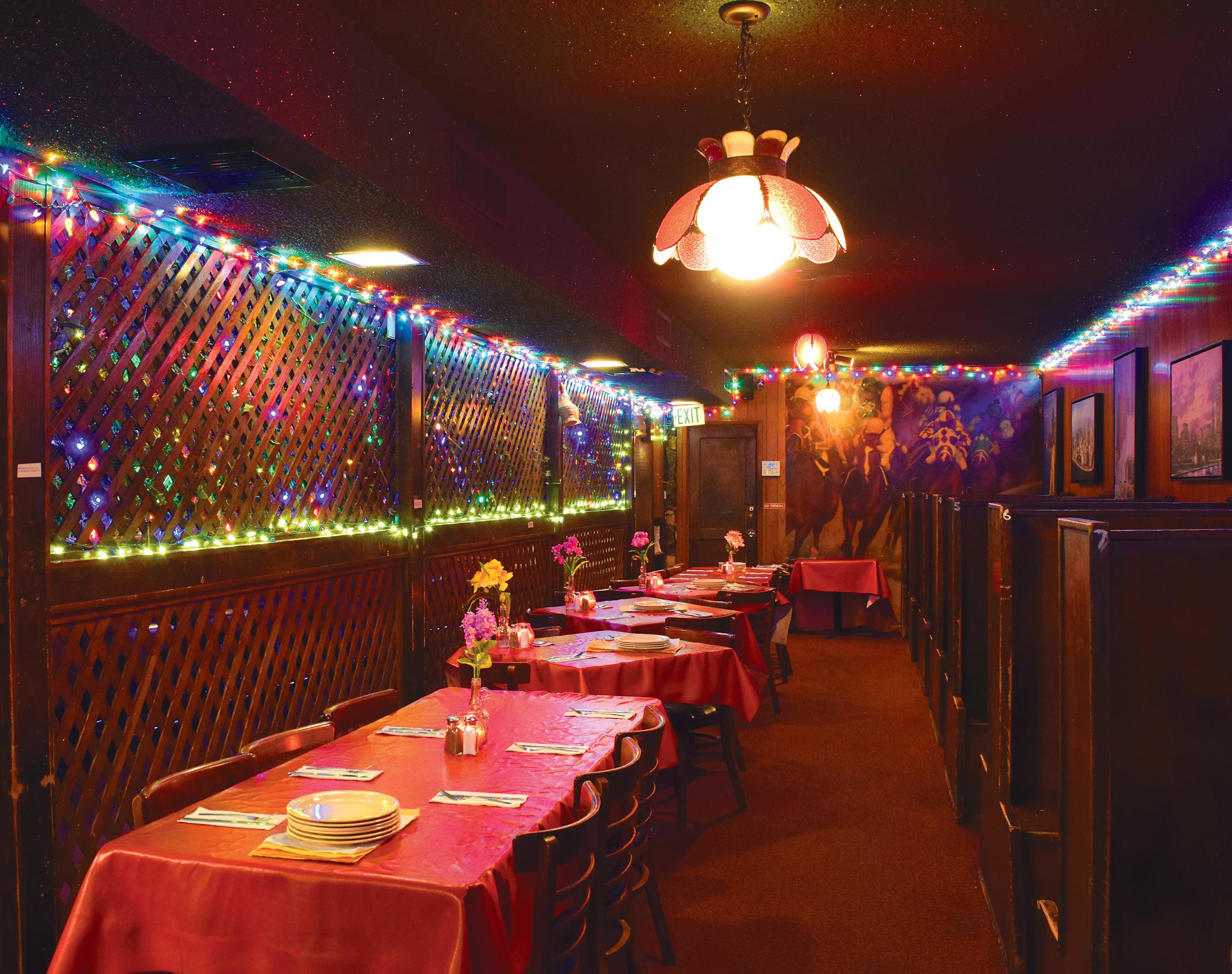 To walk into the narrow, shotgun dining room and bar is to step back in time. From the high-backed plywood booths to the stubby laminate bar, the wooden trellis with plastic grapes to the sparkly black cottage-cheese ceilings, the place has a vibe.