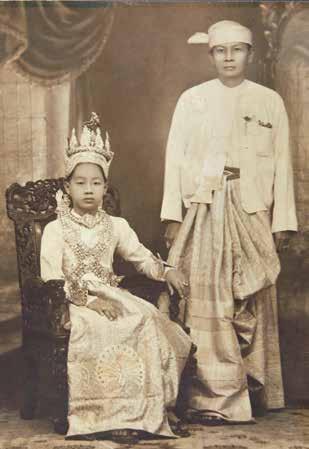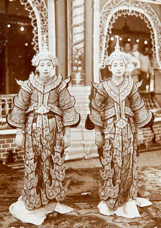 This a portrait of two teenage girls, resplendent in lavish courtstyle costumes during their ear-boring ceremony (na-twin mingala), an occasion when girls usually dressed like princesses. Here, their costumes are a replica of a Mahalatta regalia robe (1.1, 1.39) used by queens and worn over the htaing ma thein dress (1.40), with the trailing skirt visible on the floor. The headdress, see bong completed the royal look. The papier maché core was lined with silk and adorned with tinsel and sequins. Though not comparable to the original robes used at court, these Mahalatta replicas have quite a detailed construction and fine workmanship. Costumes such as these were usually rented for the occasion and would only be custom-made if the girl came from an extremely wealthy family. The lavishness of the costume and jewelry also varied, depending on the budget. At the most basic level, a simple htaing ma thein dress would be worn.