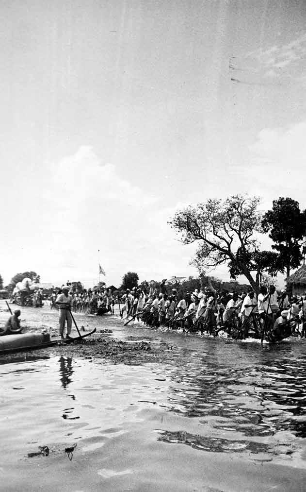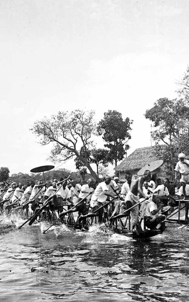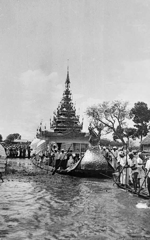 This trio of photographs captures a vibrant moment during the festival in the 1930s when long lines of racing boats, vigorously rowed by villagers using their legs, tow the magnificent Karaweik barge watched by a crowd of spectators in many small boats.