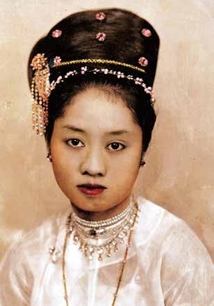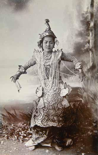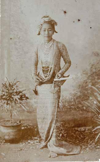 In both portraits, she has her hands in a dancing gesture. The fan was incorporated into dance after the fall of the Mandalay court. The large number of pearl necklaces gives her a highly dramatic look. In the first picture (1.27), she wears court-style dress (htaing ma thein) while in the other, she is in magnificent court style regalia. The costume was embellished with superb embroidery using metallic threads and sequins. This outfit recalls her performance as Princess Busapa from the I-naung Zat (the Burmese derivation of the Siamese romantic drama I-nao, a story inspired by the Javanese folktale), one of her famous roles.