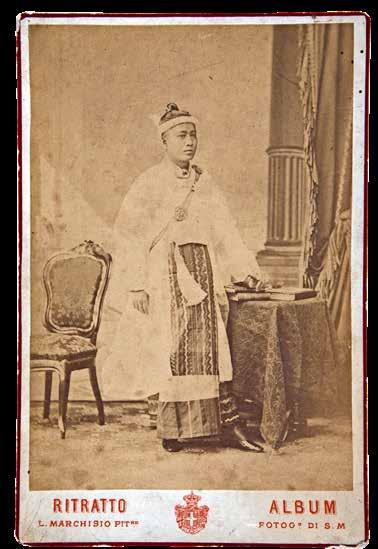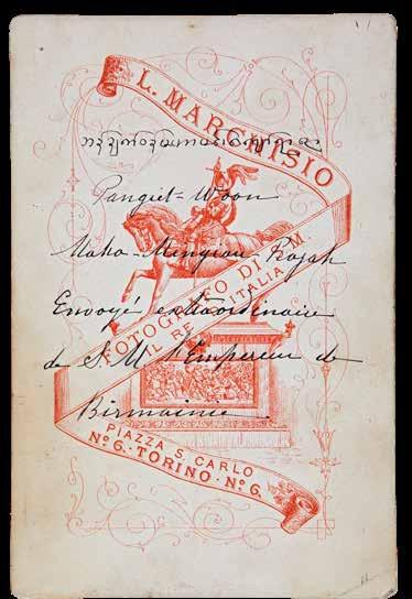In 1879, he was sent to Paris again by King Thibaw to arrange the admission of Burmese state scholars to technical institutes in France. Then, he visited Italy on the way home, when this cabinet portrait must have been taken.On the back, his full title was written both in Burmese and English. It reads ‘Pageit Woon Maha Mingiou Rajah’ and records his appointment during this mission as the ambassador extraordinary of H.M. the Emperor of Burma.