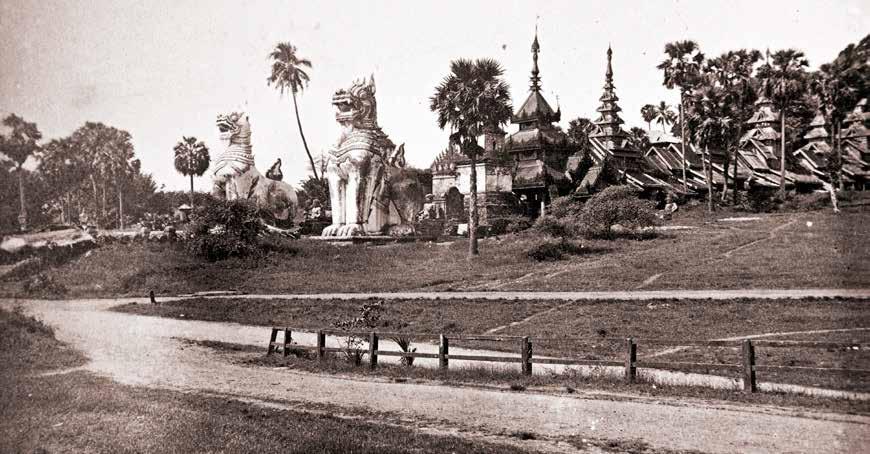 These photographs (3.45-7) show the southern entrance to the pagoda and the changes wrought over the years. The first photo (3.45), taken around the 1860s, depicts the entranceway at an early stage. A pair of gigantic guardian lions (chinthe) had been added less than a decade before. Behind each lion, the much smaller seated guardians were part of the original entrance design and have been retained throughout all subsequent changes. The second photo (3.46) shows an elaborate masonry arch with decorative grottos on both sides and topped with the spired pavilion. The entire structure is a symbolic representation of Mount Meru, the center of the universe according to Buddhist cosmology. The last photo (3.47) shows the later development of the entrance from the 1910s with the addition of a large triple-spired pavilion at the front and the enlargement of the steps up from the road. The spires, gables, and eaves were sumptuously decorated with perforated wooden decoration. This addition completely blocked the masonry arch seen in 3.46. Today, most decorative details on the staircase have been altered – only the decorative arch and the guardian statues remain intact. Unfortunately, they are not easily visible as they are still blocked by a massive front pavilion, the latest and biggest version built during military rule.