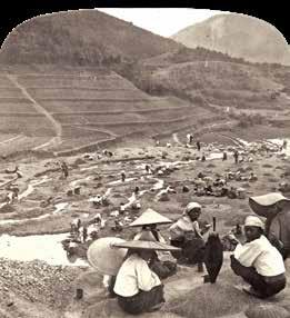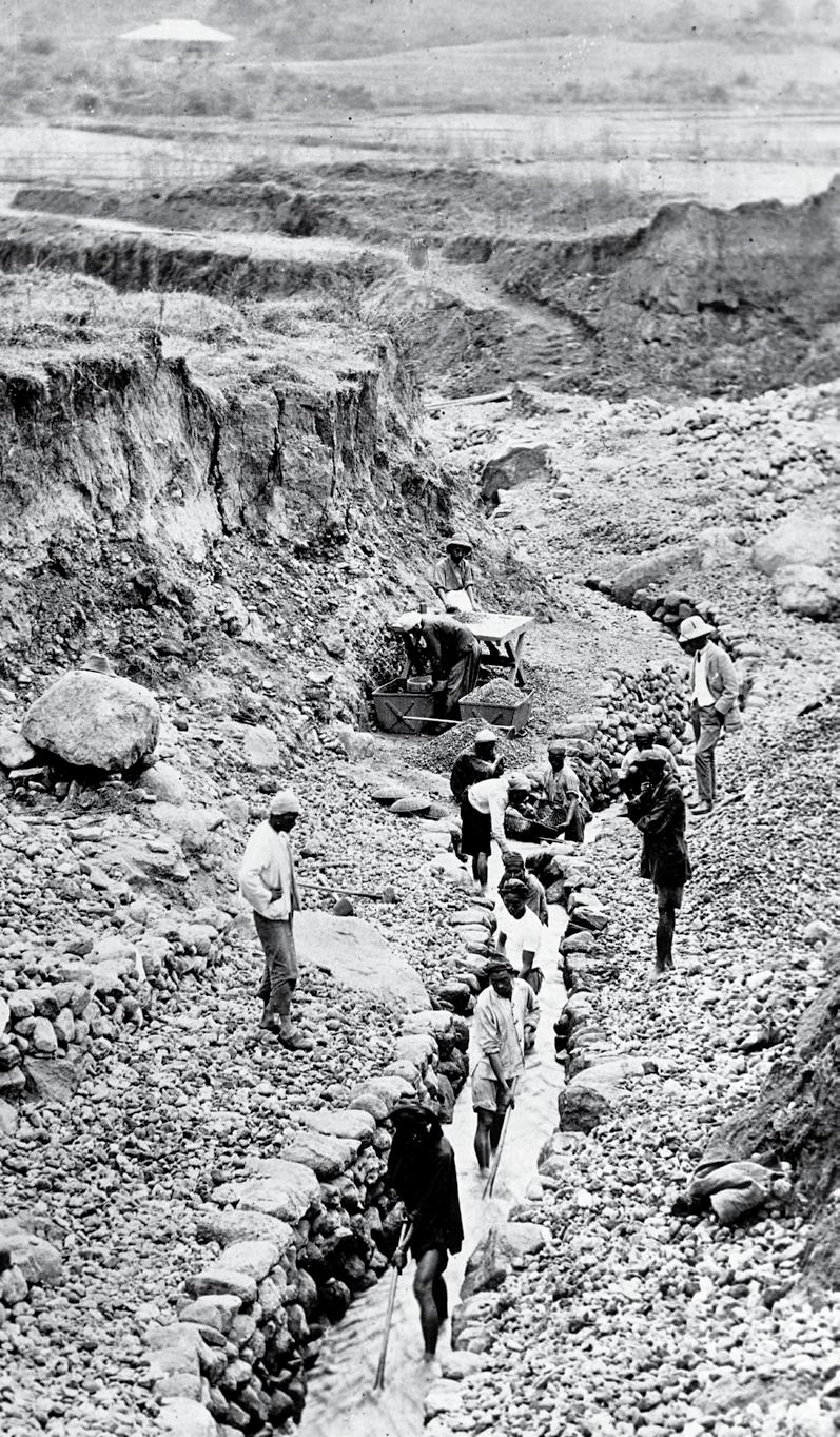 Here, a western man in a flat cap stands on the back supervising local workers who are clearing the small water course and digging up the gravel, to be rinsed and sorted for rubies. The canyon-like terrain can be seen behind. Over the years, more gorges were created as a result of the continuous digging.