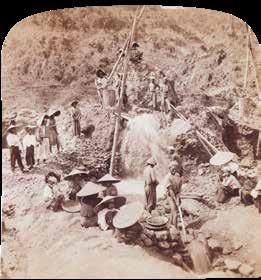 In this photo, the dug out earth and gravel is dumped into a pit where water from the hillside is poured in. The water pressure separates the dirt from the heavier gravel which sinks to the bottom and the muddy water is drawn off. The long bamboo pole with attached basket was used as a lever to lift the washed gravel from the pit for sorting.
