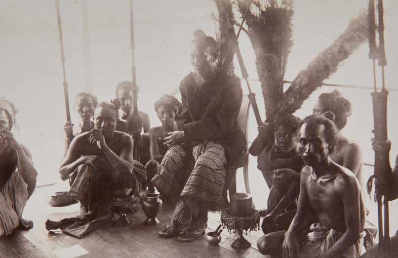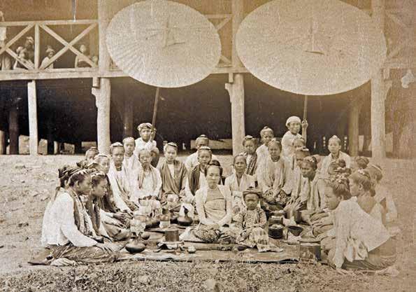 This photo by Beato was possibly taken in 1891 when British troops were sent to suppress the rebels. Here, the wife and son of the deposed prince are seen seated in the center. Both wear the attire of the Burmese ruling class and are surrounded by a large group of female attendants. Interesting regalia objects include parasols, betel nut boxes, and water flasks.