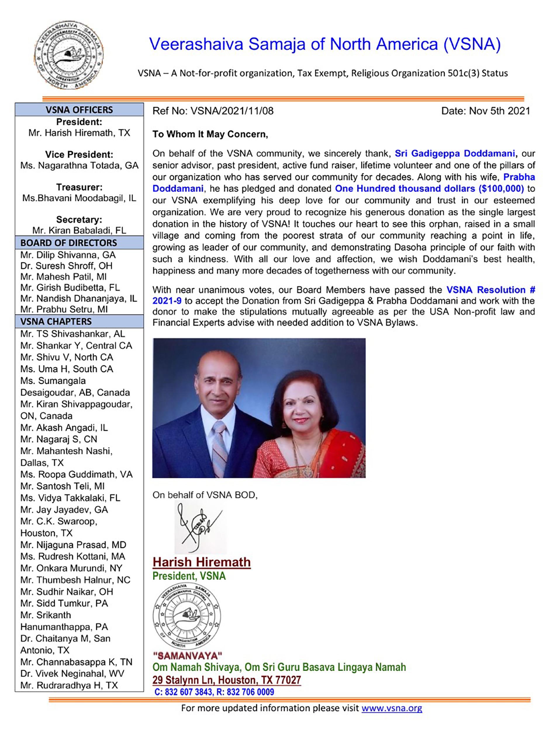 As a devout believer in the principles and practices of the way of life of the 12th century Veerashaiva Saints, we - my wife Prabha and I – would like to donate $100,000.00 to the VEERASHAIVA SAMAJA OF NORTH AMERICA (VSNA) to promote and propagate their philosophical pithy pronouncements, the Vachanas. This we believe and trust to be in the fitness of the lofty principles that led to the founding of the VSNA some 44 years ago. This donation of ours’ requires the following conditions and stipulations.