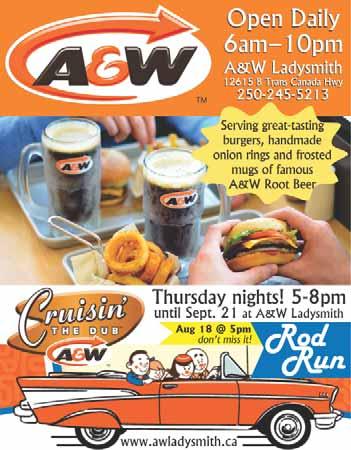Cruisin’ started in 2012, and the fi rst ones were on a Sunday. “We didn’t have any speci fic time for them to be here, and they would look around and go, where’s the other cars?” mentioned Jason Kelland, business owner of the Ladysmith A&W. Soon after, it was swapped to Thursday and given a proper time frame. Things ramped up from there, and they decided to give out A&W coupons, free pop, tea, and coffee, and even hand out some prizes as well.