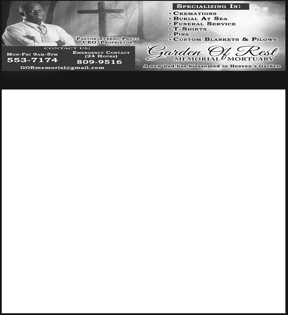 Left to cherish her memories are her husband: Joel Scott; children: Daja Smith, Bailey Scott, Cameron Bascom, Joel Scott Jr.; parents: Bettymae Rolle (deceased) Ezra Rolle; grandson: Lateko (Milkshake) Smith; sisters: Iris Pinder, Crystal Storr, Nakeisha Rolle, Ezralee Rolle-Kemp, Zilpha Sands, Iva Rolle, Mamera Oliver; brothers: Clinton, Kenroy, Jeffrey, Michael, Varoco, Jeremy Rolle; nieces: Hailey Ochoa, Albranae Oliver, Destiny and Maya Storr, Ryley Russell, Charlee-Grace Kemp, Lexi, Monet, Ashanti, Aaliyah, Tianna, Kennesha Jewdeah and Sunday Rolle; nephews: Hunter Kemp, Ethan Bannister, Isaac and Hezekiah Sands, Rickey, Ricardo and Zion Rolle, Michael Rolle Jr., Kenroy Rolle Jr.; mother and fatherin-law: Rogena Thompson, Joseph Scott; sisters-in-law: Treasure and Marina Rolle, Donnell Ferguson, Antoinette Ferguson-Smith, Perline Scott-Fowler; brothers-in-law: Clifford Storr, Stephen Kemp, Ansenio Sands, Alburn Oliver, Shawn Riley, Andrew, Tino and Quan Scott; aunts and uncles: Minister Eloise and Carlos Ramires, Minister Marie Woodside-Jackson, (Benjamin Woodside), George Woodside, Bishop Bernard Godfrey and (Overseer Eleonora Woodside), Rodney Woodside, Apostle Bursel and (Paulette Woodside). Authlyn and Angela Woodside, Gary Woodside, Colliemae Francis, Zilpha and Prince Mackey, Ethel and Joseph Oliver; cousins: Colliemae and Micheal, Cola, Lisa, Emanuel, Dennis, Ida, Ella, Ellen, Sidney, Kendricl, Malvin, Teddy, Travis, Princeton, Dave, Lena, Ednel, Kimberly, Everlyn, Dotlyn, Tangela, Jeffrey, Staretta, Jefferson, Jackson, Tino, Staretta, Idell, Ronald, Tangy, Pradesta, Teia, Jelton, Ezra Russell, Victoria Russell; relatives and friends including: Bishop Wilbert Rolle and Mother Idell Rolle, Prophetess Tera Rolle, Tina Burrows, Lashanta Greenslade, Keisha and Travis Mackey, Sherry Fowler, Coral Bowleg, Nadia Seymour, Benjamin and Emma Martin, Pastor Warren Miller and Min. Lynn Miller and the Living Waters
