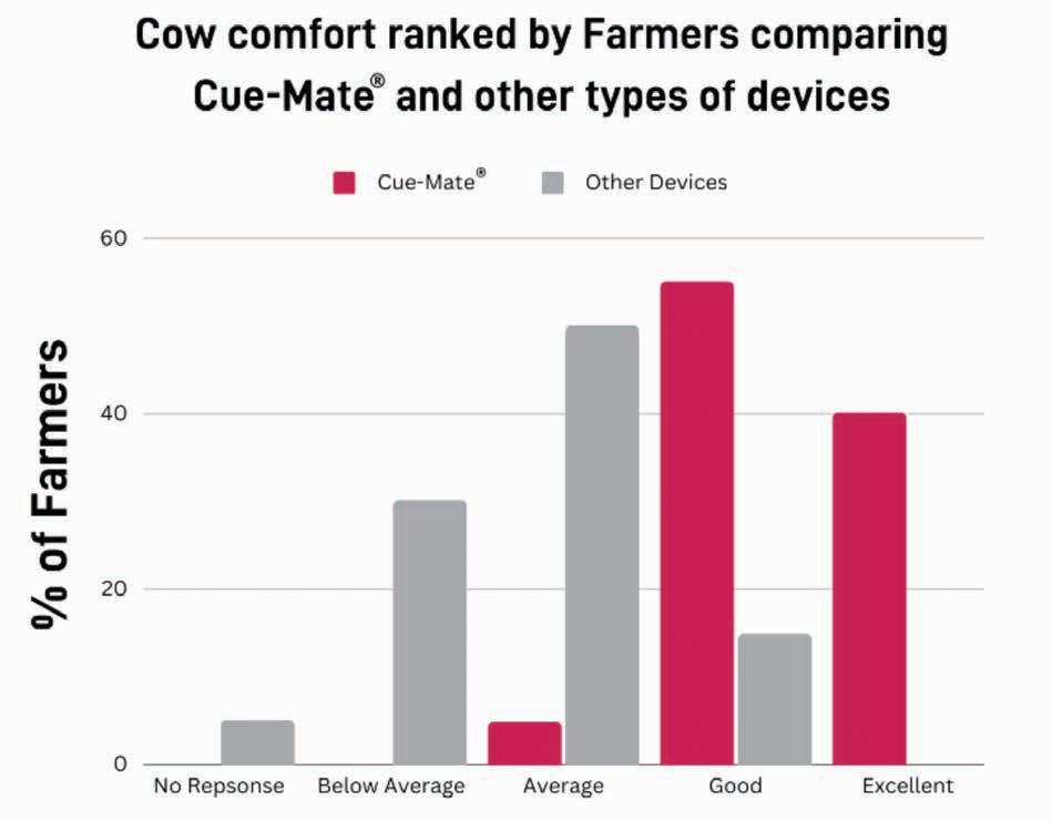 Ask any woman which device she would choose if she was making the purchasing decision and you’ll struggle to find many who wouldn’t opt for Cue-Mate®. A NZ cow comfort study showed more than 90%+ of farmers rated Cue-Mate®, with its soft silicon pods, as excellent and good which was significantly higher than other registered devices tested.