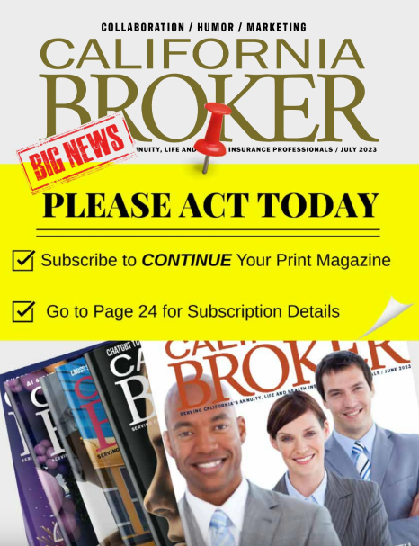 Beginning August 2023, our print piece, the California Broker Magazine professional journal becomes a paid subscription. Priced at only $18 a year, our loyal readers can continue to receive California Broker Magazine mailed to them in print each month. Next steps: