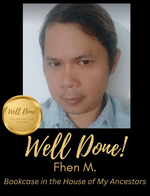 Fhen M. studied the academic subjects Writing in the Discipline, The Literature of the Phillipines, and The Literature of the World at Eastern Visayas State University. The Waray poem “Uyasan” (“Toy” in English”) written by Fhen M. was published in a collection of literary works entitled Pinili: 15 Years of Lamiraw. His English verses "Lighthouse," “Seaport,” “Barbeque Stalls along Boulevard,” and “Tetrapod” appeared in Poetica anthology series published by Clarendon House. In 2024, Red Penguin Books’About Time: A Coming of Age Poetry Anthology will publish his piece “Outside the Block Universe". One of his poems will also be included in Flora/Fauna Anthology by Open Shutter Press. Fhen M. submitted verses in Waray for the 5th Lamiraw Creative Writing Workshop, including the siday “Duha nga mga pagtug-an” (translated in English as “Two confessions”). David Genotiva, Merlie Alunan, and Victor Sugbo were some of the distinguished panelists of this writing workshop held from the 5th to the 7th of November 2008.
