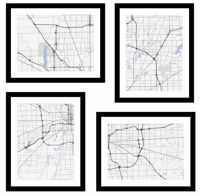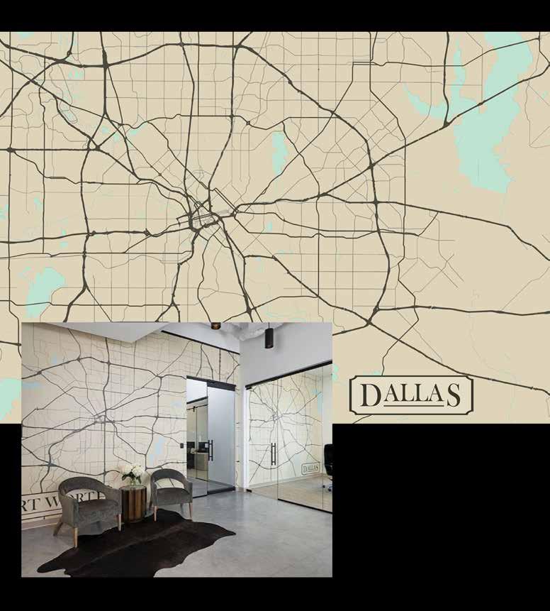 Our client requested a similar mural that was not available in the needed size. Our photoshop crew sourced two vector maps and stitched them together to create the base image. The Dallas label, Ft. Worth label, and the compass were added to the image with the colors changed to match the client’s specifications.