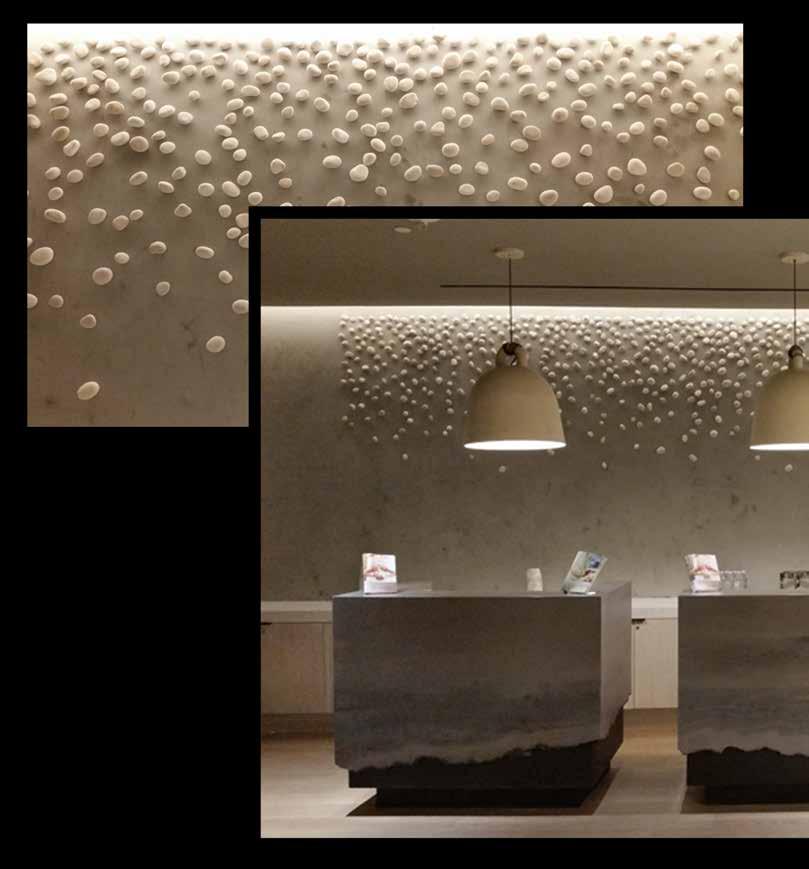 This is a spa installation titled “Raining Stones.” We designed a template for the placement of each stone. All 866 stones were hand-selected and individually anchored to a Venetian plaster wall.