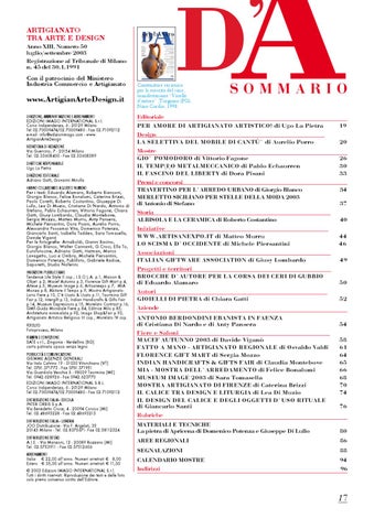 Editoriale PER AMORE DI ARTIGIANATO ARTISTICO! di Ugo La Pietra Design LA SELETTIVA del mobile di Cantù’ di Aurelio Porro Mostre GIO’ POMODORO di Vittorio Fagone IL TEMP(I)O METALMECCANICO di Pablo Echaurren IL FASCINO DEL LIBERTY di Dora Pisani Premi e concorsi TRAVERTINO PER L’ARREDO URBANO di Giorgio Blanco MERLETTO SICILIANO per StellE DELLA MODA 2003 di Antonio di Stefano Storia ALBISOLA E LA CERAMICA di Roberto Costantino Iniziative WWW.ARTISANEXPO.IT di Matteo Murru LO SCISMA D’OCCIDENTE di Michele Piersantini Associazioni ITALIAN GIFTWARE ASSOCIATION di Giusy Lombardo Progetti e territori BROCCHE D’AUTORE PER LA CORSA DEI CERI DI GUBBIO di Eduardo Alamaro Autori GIOIELLI DI PIETRA di Chiara Gatti Aziende