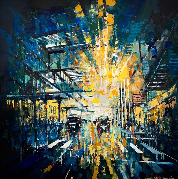 Ewa Wojnarowska to artystka, która w swojej twórczości koncentruje się na ujęciu miasta oraz jego dynamiki. W jej warsztacie tech nicznym można zauważyć echa ekspresjo nizmu.
