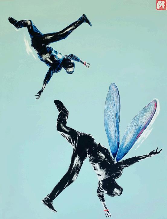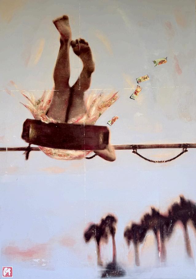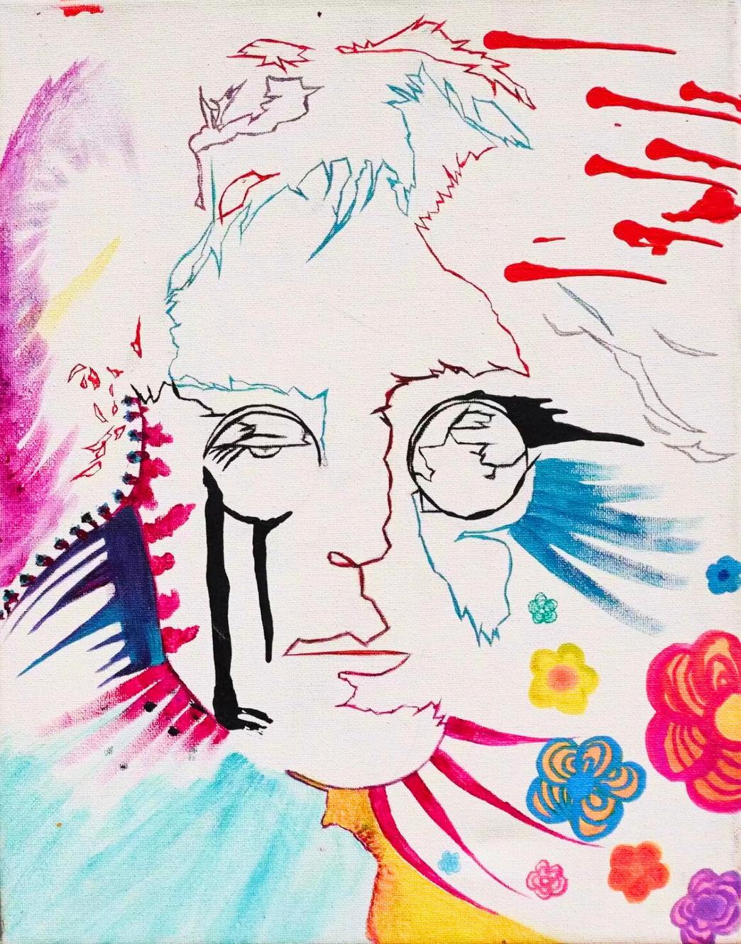 Her piece Shhh… No One Cares explores how childhood memories shape our inner world Through playful yet unsettling imagery feet suspended mid-motion, bursts of color, and drifting candy wrappers the work reflects on freedom, vulnerability, and the quiet restrictions that follow us into adulthood Despite its collage-like appearance, the painting is entirely created through acrylic and mixed media, capturing a moment where innocence meets introspection