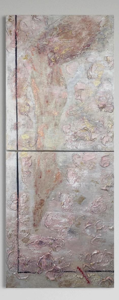 Angelica Briones is a mixed-media painter who works with oil, acrylic, watercolor, and modeling paste to create richly textured surfaces Her paintings often blend hints of the human body with abstract forms, using soft tones, layered textures, and subtle metallic touches Briones’ process is expressive and intuitive, allowing form and emotion to rise naturally through the material