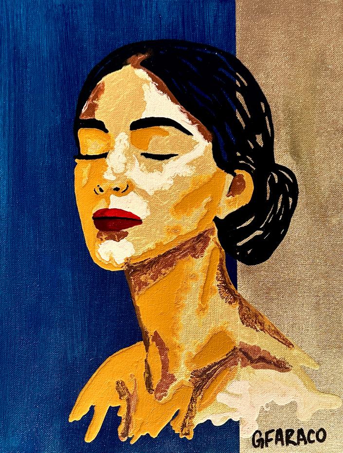 Her piece Emi captures a moment of serene introspection. The woman’s closed eyes and calm expression are set against a striking contrast of deep blue and warm gold, suggesting a balance between strength and tranquility. Soft gradients and subtle textures highlight the beauty of inner peace—an essential theme in Faraco’s ongoing exploration of the feminine spirit and its quiet, enduring power.