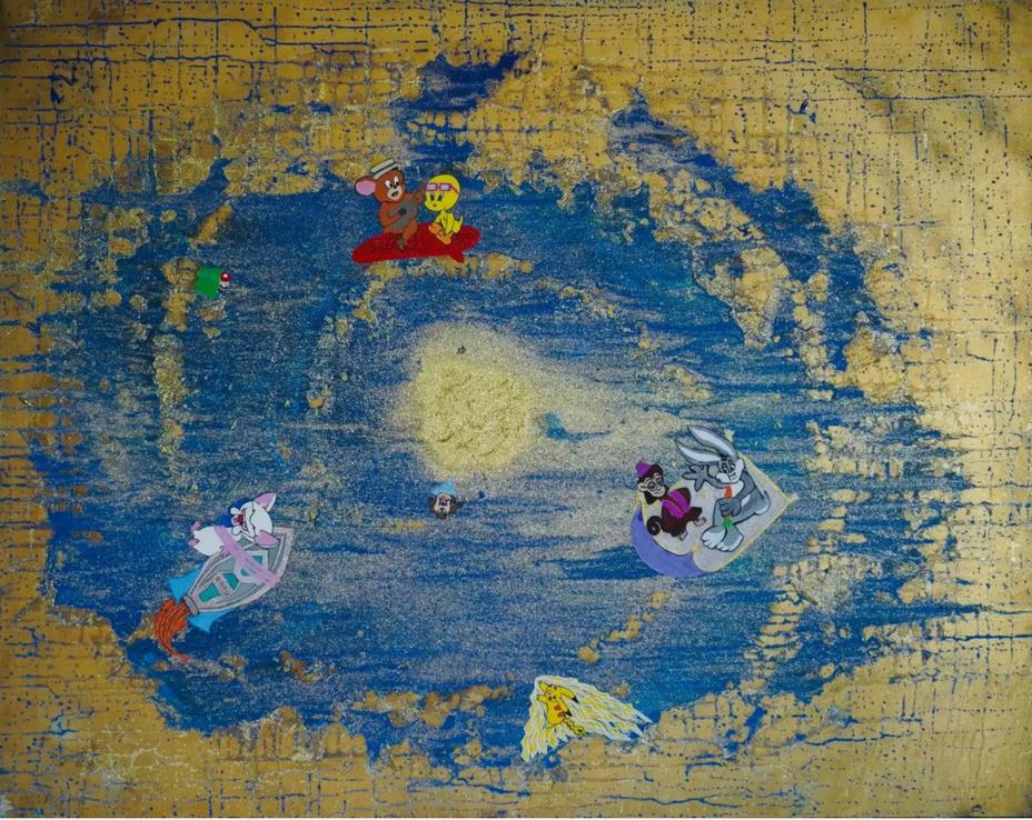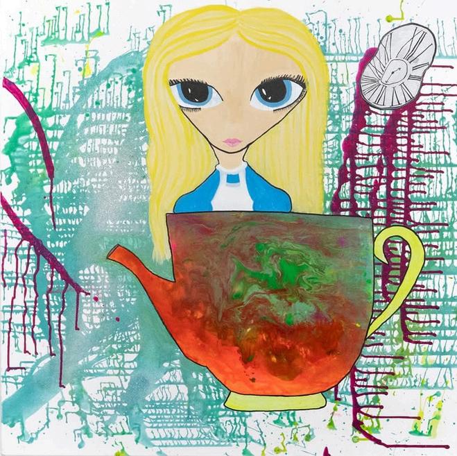 For example, E-Tea came to DeMeo in a dream and encapsulates the artist’s signature use of glitter and her technique of pouring and throwing paint directly onto the canvas. Dreamscapes like Matrix, Fairy Portal and Portal Hopping are otherworldly and surrealist, suggesting transformation and transfiguration. The artist playfully incorporates recognisable motifs in her paintings, such as dollar bills, cartoon characters and musicians, creating her own pop iconography of contemporary culture.