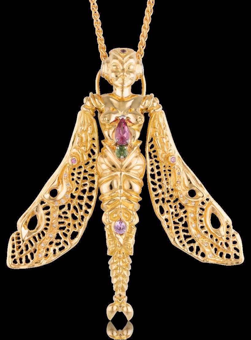 Influenced by the Rene Lalique’s Dragonfly Corsage (circa 1897-98), our Jeweller Kathy designed and handmade the Dragonfly Lady in 18ct Yellow Gold. Taking 80 hours to carve in wax with painstaking attention to detail, and another 40 to complete and set the gemstones, the intricacies within this piece are truly a sight to behold.