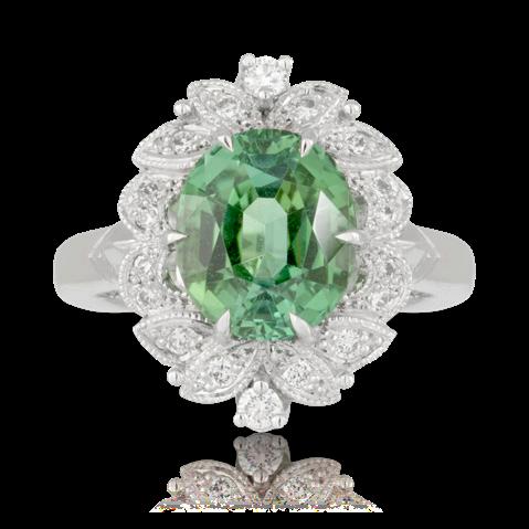 Jardine is radiant, captivating of attention, a shade of green so distinct, her clarity unrivalled. Central to the collection is the Jardine Ring, featuring a 3.91ct cval cut Green Tourmaline surrounded by our signature Artisans Diamond leaf halo detail. Masterfully set Diamonds brilliantly scintillate, positioned impeccably with exquisite basket settings intrinsic to this formidable design.