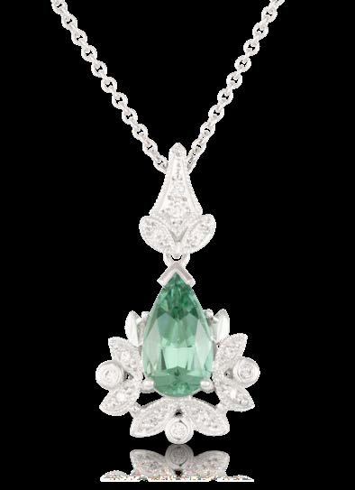 Bold geometricity in Art Deco style harmoniously unite in our matching Jardine Earrings and Pendant. Elegantly swaying, the green Tourmalines are resplendent with exquisite White Diamonds. The Jardine Pendant features a vivid green teardrop, surrounded by meticulous handmade detail resolute in its admiration of French Garden mystique.