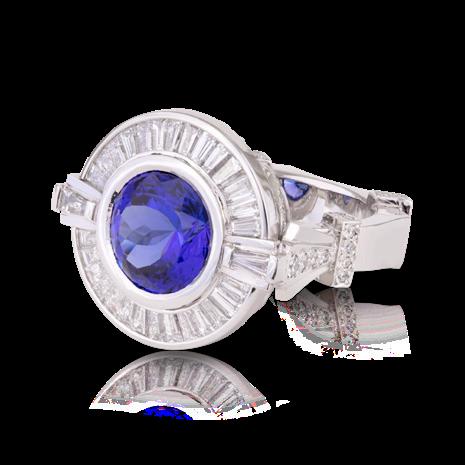 Our Merelani ring combines the vibrancy of Tanzanite with an exhilarating abundance of Diamonds making her truly a delight from all angles. The 5.37ct Round Brilliant Vivid Violet/Blue Tanzanite is surrounded by an impressive halo of over 1.64ct Tapered Baguette Diamonds. The band is a distinct angular style shank for visual interest and comfort.