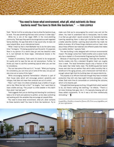 make sure that you’re encouraging the correct ones and not the others. You have to understand how to manipulate, how to make it so that you get what I would consider to be favorable bacteria. Learning everything there is about gin distillation has made me a better absinthe distiller. Learning about absinthe has made me better at amaros. All of these things intertwine and as I learn more about these different raw materials and different yeasts that makes me a better distiller,” explains Todd. The new building is also designed with minimum environmental impact. The design comes from Todd’s brother and co-owner Scott, who has a master’s in Environmental Engineering from Stanford. Because of recycling and composting, Todd says the waste the facility creates only fills a standard 36-gallon trash can roughly once a week. The wood fermenters require only a fraction of the rinse water that metal tanks need. The 8,000-square-foot barrel house next door has an earthen floor which adds humidity that is beneficial to the aging process, and a translucent roof that lets in enough natural light that the building does not require electricity. The property is so efficient that even though they have increased production they still only have eight full-time employees. It also allows Todd more time to concentrate on controlling the outcome, which is his favorite part. “I thought that brewing was my thing, I thought that’s what I wanted to do, but there’s nothing like distilling,” he reflects. “There’s a lot more thinking that goes into it. It’s basically brewing with all these added components. To me it was a lot more intellectually stimulating.” Leopold Bros. Distillery is located in Denver, CO. Visit www.leopoldbros.com for more information.