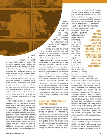 certain k e y markets) to create a viable DTC platform. Under this approach, product moves through the three-tier system. Accordingly, the “bricks and clicks” strategy does not offer the advantage of compressed margins that direct interstate sale and shipment offers. This method does, however, involve lower shipping costs, because product would be delivered to consumers by instate retailers, rather than from remote locations. Further, to a consumer placing an order (most likely online), the ordering and delivery experience is similar to that of the direct interstate sale and shipment model. On the downside, the “bricks and clicks” strategy is expensive and resourceintensive. Retail locations can be expensive to establish, and in most states a retailer must have at least some nominal retail store functions (i.e., be open to the public at least sometimes). Fulfilling consumer orders on a national level also would require significant capital investments. Existing large national retailers are best-positioned to use this strategy for direct-delivering spirits to consumers: Since such entities already have retail licenses and premises, additional investments necessary to establish a delivery system likely would be WWW.ARTISANSPIRITMAG.COM