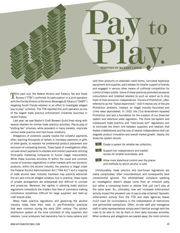 his past July, the federal Alcohol and Tobacco Tax and Trade Bureau (“TTB”) confirmed its participation in a joint operation with the Florida Division of Alcoholic Beverages & Tobacco (“DABT”) targeting South Florida retailers in an effort to investigate alleged “pay to play” schemes. The TTB reported this joint operation as one of the largest trade practice enforcement initiatives launched in recent history. Last year, we saw Boston’s Craft Brewers Guild fined along with several retailers for similar trade practice activities. Pay-to-play or “slotting fee” schemes, while prevalent in many markets, implicate various trade practice and tied-house violations. Allegations of violations usually involve the unlawful payments, often reaching thousands of dollars in monetary payments or gifts of other goods, to retailers for preferential product placement and exclusion of competing brands. These types of investigations often uncover direct payments to retailers and indirect payments utilizing third-party marketing companies to funnel illegal inducements. While these business activities fit within the usual and common course of business negotiations in other markets with non-alcoholic products, within the alcohol industry, the practice is illegal under the Federal Alcohol Administration Act (“FAA Act”) and a majority of state alcohol laws. Industry members may publicly admonish the act and criticize alleged violators, but in practice, these types of private arrangement are widespread and difficult to uncover and prosecute. Moreover, the rigidity in standing trade practice regulations contradicts the modern free flow of commerce making compliance sometimes difficult for large suppliers and start-up craft brands alike. Many trade practice regulations still governing the alcohol industry today have their roots in pre-Prohibition practices that were common during the early 20th century. The alcohol distribution system at the time consisted of only suppliers and retailers. Local producers had ownership ties to many saloons and WWW.ARTISANSPIRITMAG.COM