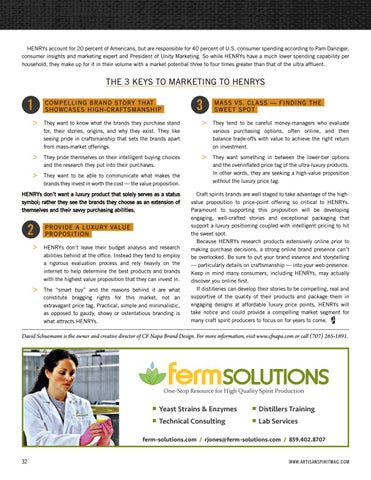 Craft spirits brands are well staged to take advantage of the highvalue proposition to price-point offering so critical to HENRYs. Paramount to supporting this proposition will be developing engaging, well-crafted stories and exceptional packaging that support a luxury positioning coupled with intelligent pricing to hit the sweet spot. Because HENRYs research products extensively online prior to making purchase decisions, a strong online brand presence can’t be overlooked. Be sure to put your brand essence and storytelling — particularly details on craftsmanship — into your web presence. Keep in mind many consumers, including HENRYs, may actually discover you online first. If distilleries can develop their stories to be compelling, real and supportive of the quality of their products and package them in engaging designs at affordable luxury price points, HENRYs will take notice and could provide a compelling market segment for many craft spirit producers to focus on for years to come.