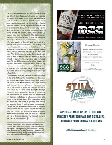 Reade A. Huddleston is Head of Production at Headframe Spirits in Butte, Montana. He received his Masters Degree in Brewing and Distilling Sciences from Heriot-Watt University, and is fascinated with all things drinkable. If you would like to contact him about any strange and forgotten spirit, please email him at ReadeHuddleston@gmail.com. WWW.ART ISANSP IRITMAG.COM
