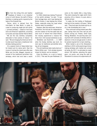 powerhouse. “In 1900, Ireland was making 75 percent of the world’s whiskey,” he said. “It was their heritage style, and it was feeding the British Empire, it was feeding the United States, especially along the coast where bourbon wasn’t as prevalent.” However, after two world wars, American Prohibition, the Irish war for independence, and the creation of the free state that severed much of Ireland from Great Britain, the industry experienced a massive fall. Down from 150 licensed distilleries to two — Middleton and Bushmills — in 1987 when the Cooley distillery was built, Ireland saw its traditional pot-distilled whiskey all but disappear. “This old traditional style nearly died out,” Patrick Miller said. “Irish whiskey became known for blends, such as Jameson.” Enter the Millers, on a visit to Ireland in 2011. That was the year Redbreast 12