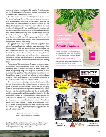 securing of building permits using this material. As with many aspects of the legal position of hemp, the situation remains fluid and is likely to shift in the foreseeable future. The other major component from hemp that can be considered “structural” are hemp fibers. Whilst hempcrete can be considered to be a rather modern innovation, there is evidence to suggest that hemp fibers have been woven since at least 10,000 years ago. For fabric, it was considered to be a “poor man’s” choice, due to its roughness, but its durability is at least 50 percent greater than cotton. Significant technological advances with hemp fiber processing have been made to soften hemp fibers since the 1980s. Ironically, hemp fiber is being increasingly considered as a replacement for petrochemical-based fibers, a 180-degree change from around 100 years ago as petroleum-based synthetic fibers reduced demand for hemp fibers in the early 20th century. The applications of hemp fiber for distilleries are perhaps more subtle. Paper, cardboard, and packaging materials produced from hemp fibers are a viable and potentially more sustainable base material than those made from wood, so opportunities exist not only for distilleries but for other industrial and domestic applications. As hemp fiber produces paper and cardboard that are tougher than tree-derived pulp, the recycling options for hemp-derived materials are enhanced simply because of the relative robustness of hemp fibers. Perhaps one of the most noteworthy claims for hemp is as a replacement for petrochemical-based “plastic” parts. This is already happening, with car manufacturers such as Volvo, Porsche, and BMW incorporating hemp-based bioplastic composites in their manufacturing operations. The sustainability credentials are enhanced by the superior strength and lightness of the hemp-based materials. Clearly, such bioplastics can have a substantial future in the distillery, not the least for use in logistics fleets. The potential for hemp-based products in a distillery extends far beyond the components that might first spring to mind: i.e., terpenes, terpenoids, and cannabinoids. Construction and packaging materials are all ripe for the incorporation of hemp-based derivatives, not only for sustainability claims but also for additional desirable properties and generally enhanced performances. Legislation in place since the 1930s has substantially limited research into and application of hemp-based derivatives, but there seems to be a growing momentum to re-explore these opportunities. With that in mind, Oregon State University’s Global Hemp Innovation Center in Corvallis is actively pursuing research and partnerships around the world to fully exploit the many hemp-based opportunities this new-old crop provides.