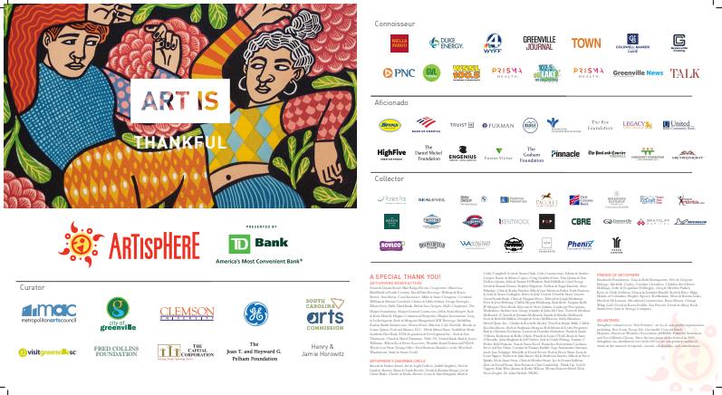 Logo with link on https://artisphere.org/sponsors/, and https://artisphere.org/culinary/#wine-beer pages Name recognition on all Press Releases and Media Kits Name recognition in Artisphere Staff Email Signature Block Logo recognition in Print + Digital Ads: The Greenville News (51,600): The Greenville Journal (161,200); The Anderson Independent (8,852); The Asheville Citizen Times (20,898); The Spartanburg Herald Journal (23,930); and TOWN Magazine (144,900) Marketing & Public Relations Benefits (4,068,634 Total Impressions) (96,987 Sessions / 66,404 Unique Visitors)