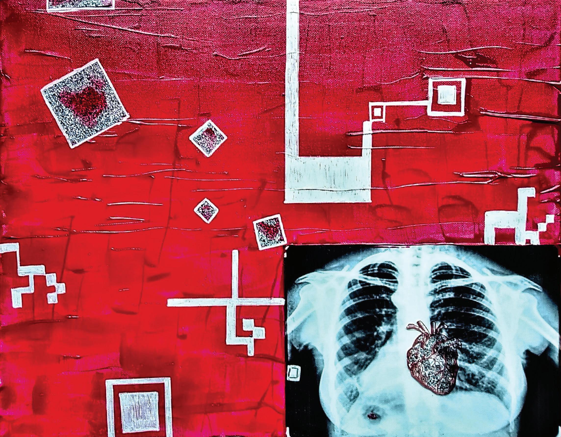 acrylic paints, resin, thread, fabrics 60 cm x 48 cm x 2 cm 2021