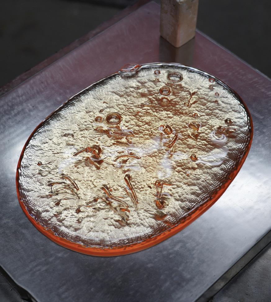 Step 1 - Molten glass poured through metal mesh (top left) hot glass on steel 2 cm x 32 cm x 25 cm 2022