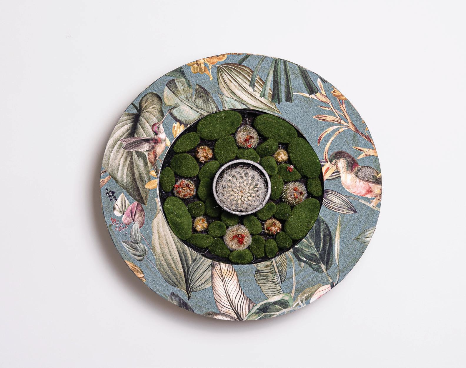 May I Borrow a Cup of Sugar? (top right) acrylic paint, thread, upholstery fabric, wood 25 cm x 15 cm x 2 cm 2022