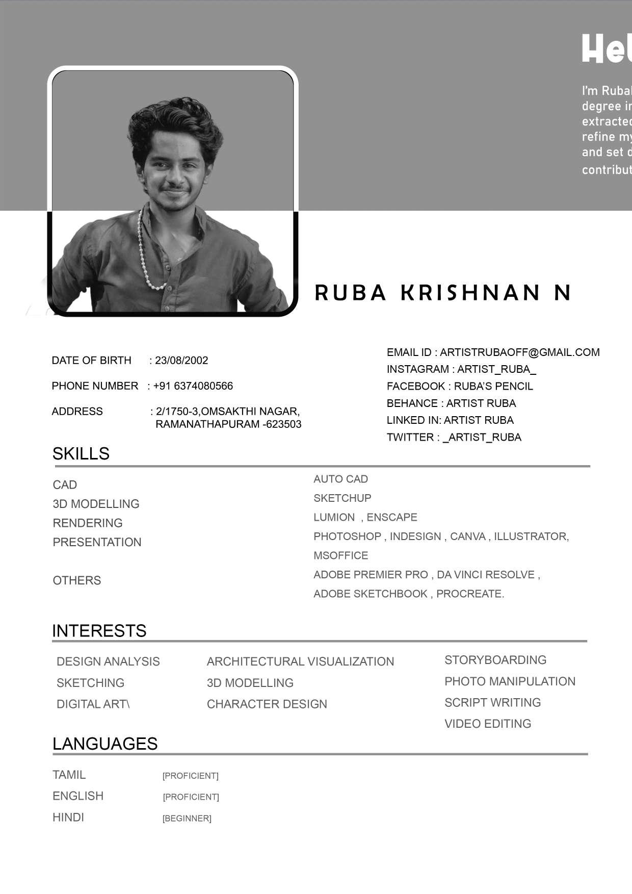I’m Rubakrishnan , 20 -year- old Architecture student currently pursuing my 4thyear undergraduate degree in MEASI Academy of Architecture ,Chennai .This portfolio consists of selected works extracted from my architectural journey (2019-2023). I am always looking for oppurtunites to refine my skills , improve my experience and gain expertise in the industry of design , architecture and set design. Wishing to work closely with these fields, I believe in creating unique designs and contribute my ideas to cater to the today’s society.