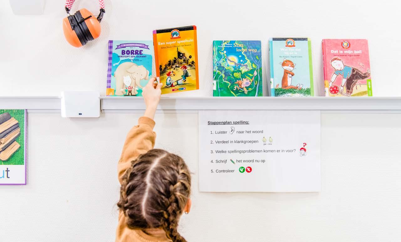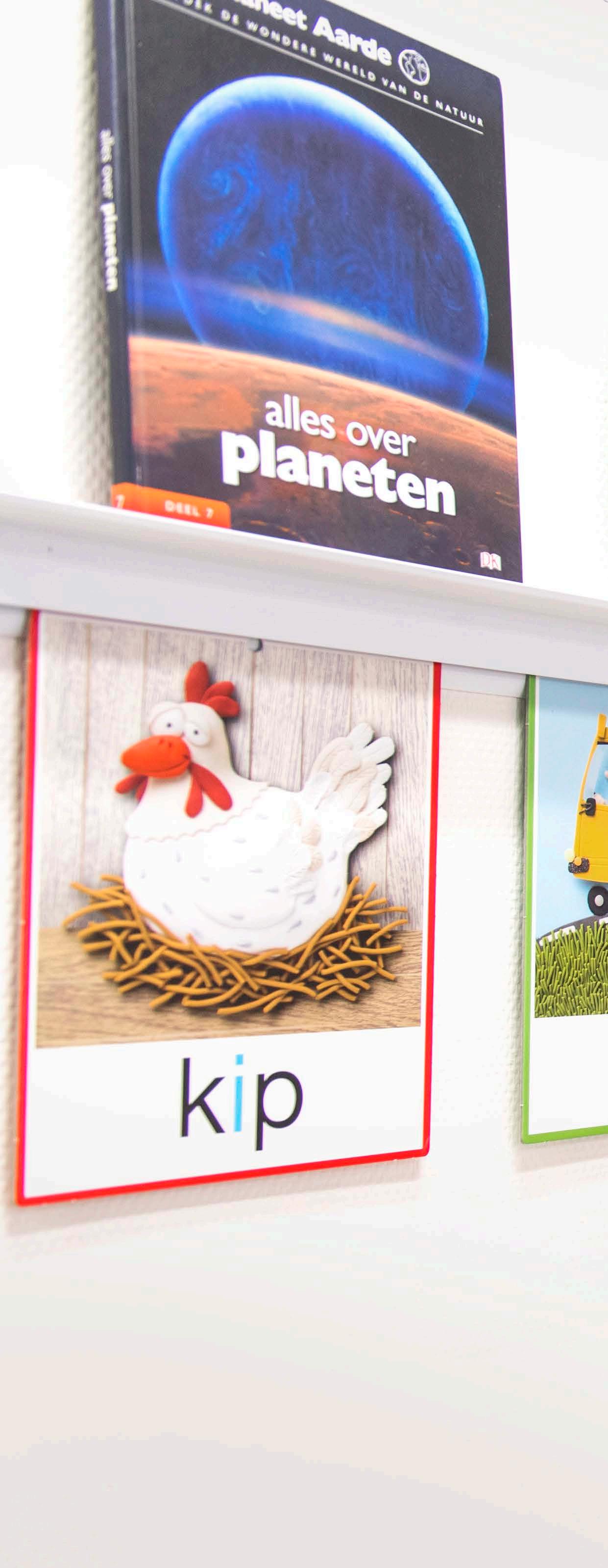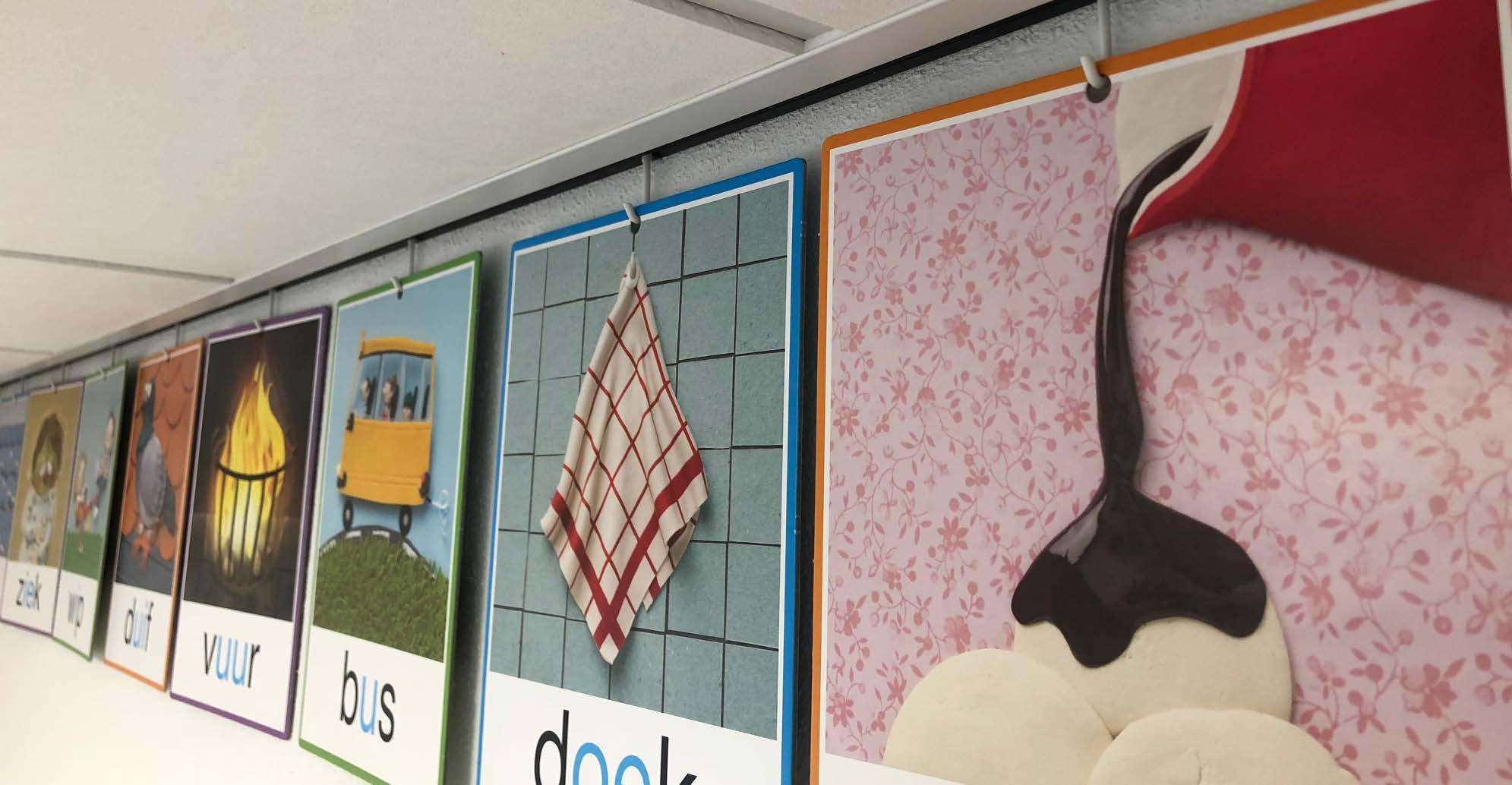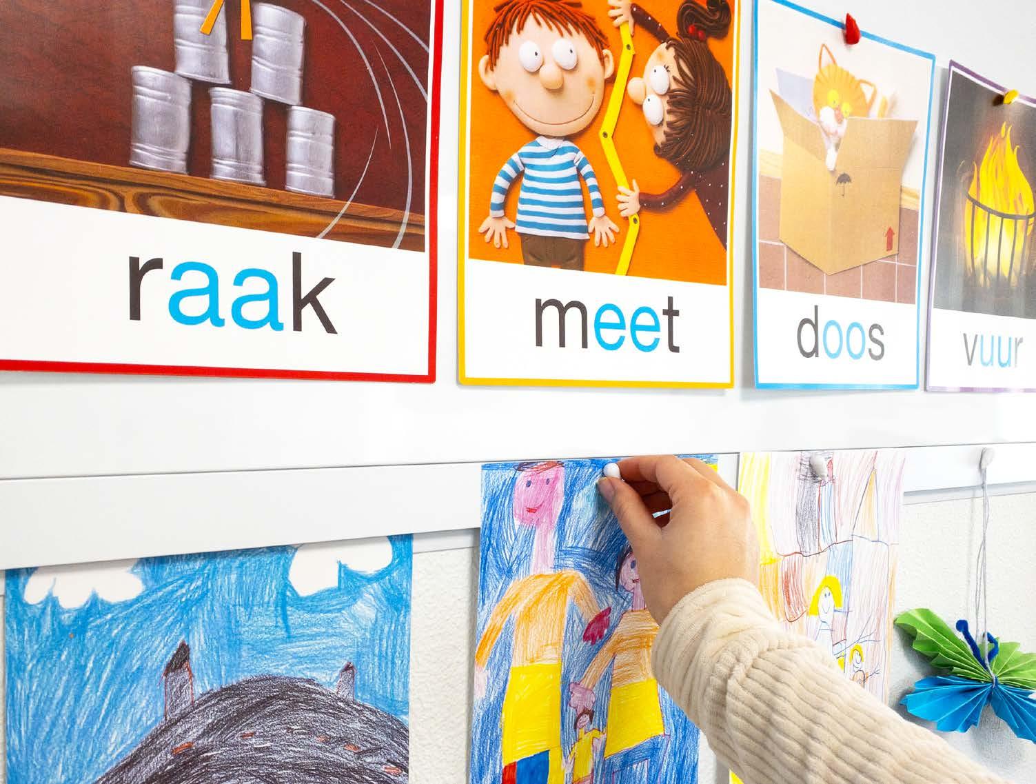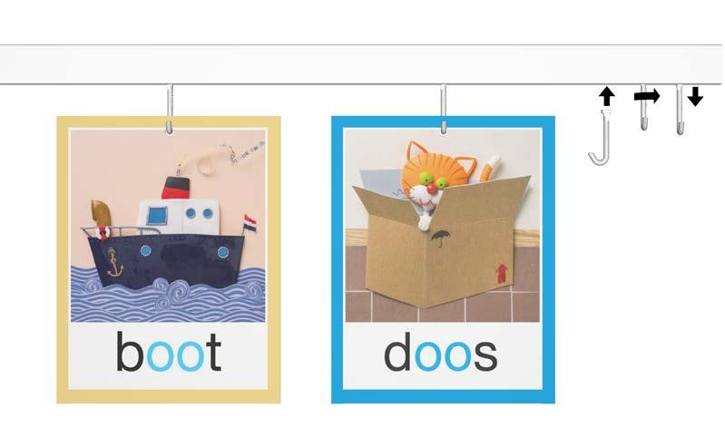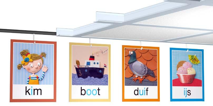 De door Artiteq ontworpen Twister Hooks, in combinatie met één van de Artiteq ophangrails, bieden een ideale manier om flexibel te werken met de kaarten van de methode ‘Veilig Leren Lezen’. In klaslokalen die voorzien zijn van een systeemplafond, kan een Top Rail naast het plafond gemonteerd worden. Een andere optie is de Click Rail: een rail die op de muur gemonteerd wordt. De Twister Hook is eenvoudig in de rail te klikken en is makkelijk te verplaatsen. De kaarten hangen binnen één seconde. Nu is het aan de kinderen om te leren lezen.