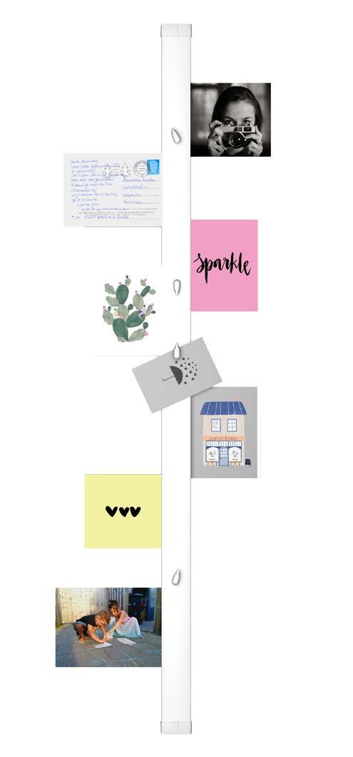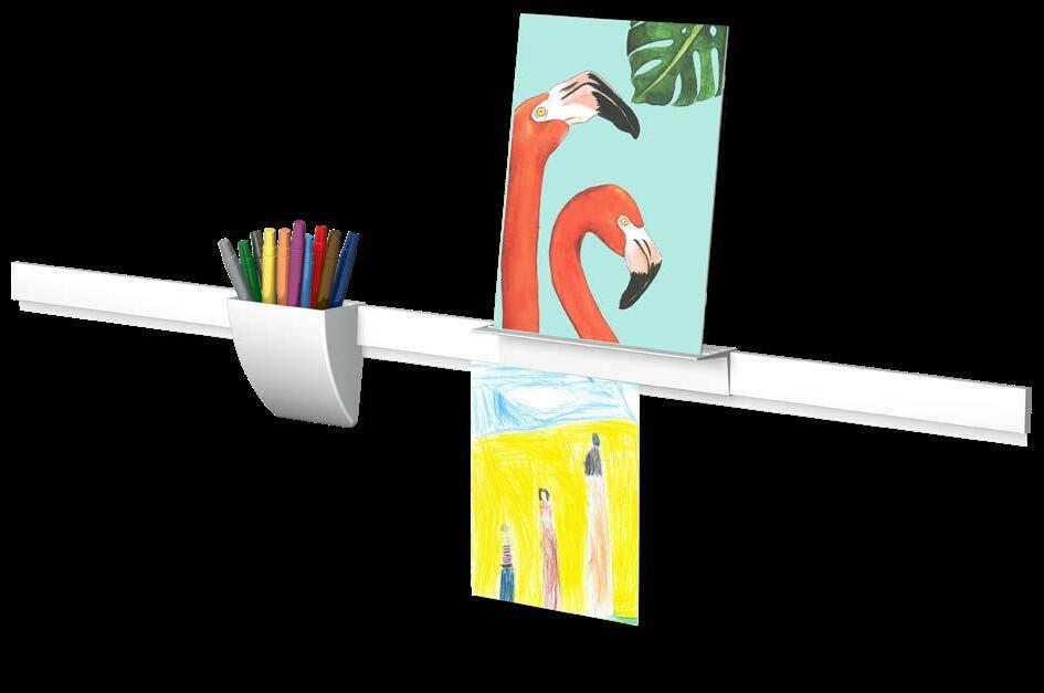 Voor de eigen gemaakte kunstwerken Eigen gemaakte kunstwerken en beeldjes van klei of piepschuim mogen tevens gepresenteerd worden in de klas. Nu eenvoudig door de Info Rail met de speciale Support Clip. Met de Support Clip wordt een extra dimensie toegevoegd aan de Info Rail. Voor elk kind een eigen Support Clip, met de mogelijkheid daar het 3D werkje te presenteren en etaleren. Een eenvoudige en bijzondere oplossing voor de perfecte presentatie. De Support Clip wordt eenvoudig op iedere gewenste plek aan de Info Rail bevestigd. Het vlak is 6 cm breed en 25 cm lang, ideaal voor het presenteren van de werkjes. PRESENTATIE