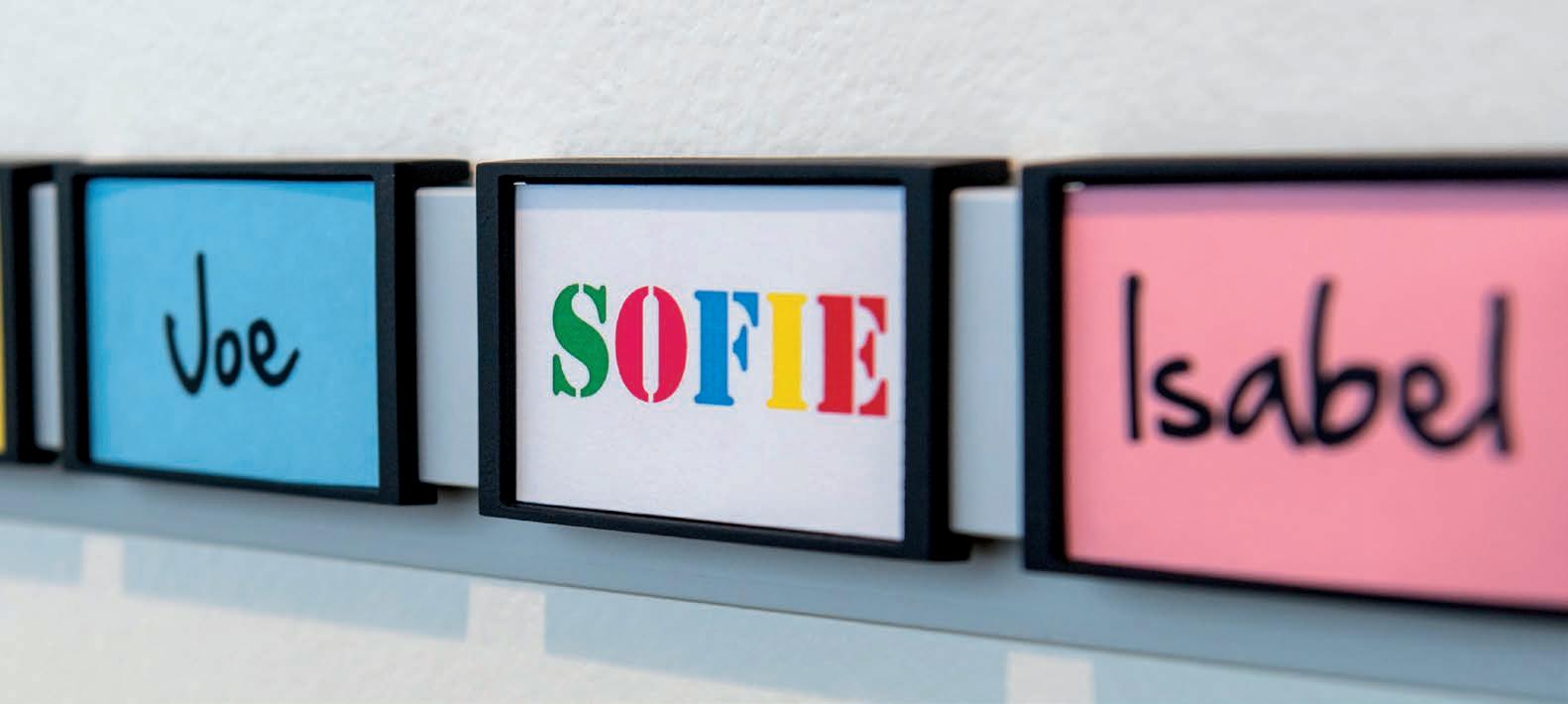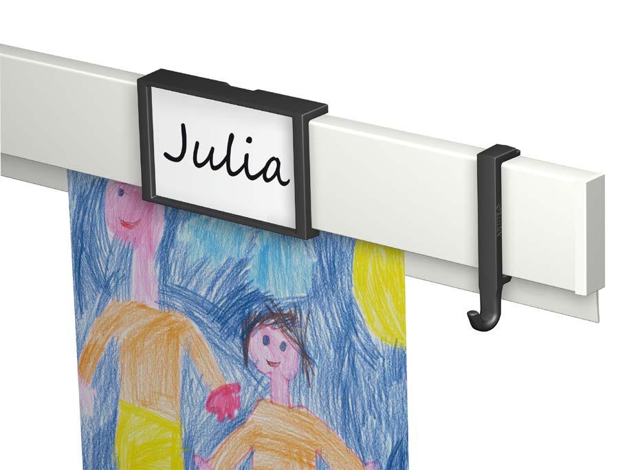 Voor elk kind een eigen clip, met de mogelijkheid om er de eigen naam op te zetten. In elke gewenste vorm! Een bijzondere oplossing voor de perfecte presentatie. Altijd aanpasbaar en steeds 100% kwalitatieve uitstraling, hoe vaak de clip ook wordt gebruikt. Behalve een leuke oplossing voor de kinderen om hun werk te presenteren, is de me -Clip ook door leerkrachten en directie te gebruiken als een persoonlijke communicatiemiddel. Handig, rechtstreeks en snel aanpasbaar, dankzij de combinatie met de slimme flexibele eigenschappen van de Info Rail. me - CLIP HANDIG, EN PERSOONLIJK