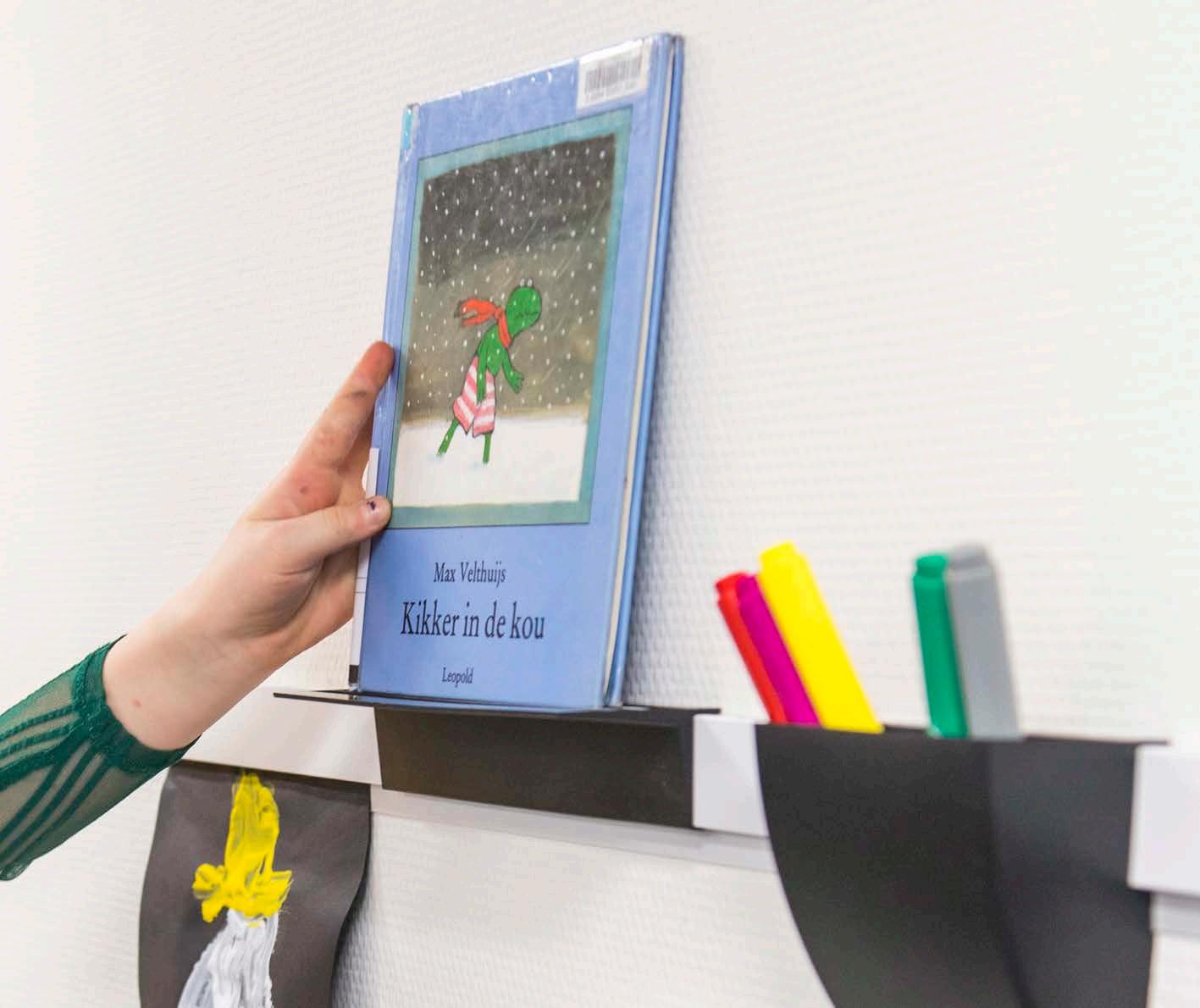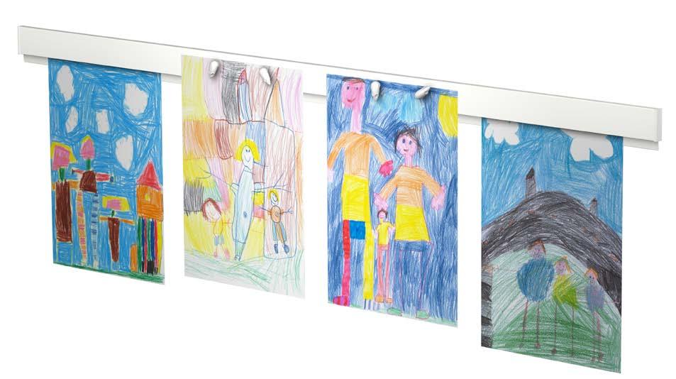 Veelzijdig presentatiesysteem aan wand De schoolwanden worden veel gebruikt om lesmateriaal, tekeningen, werkjes of leesmateriaal netjes en veilig te presenteren. Een veelzijdig presentatiesysteem is gewenst waar al deze spullen op een nette en georganiseerde manier aan de wand worden gepresenteerd. Met de Info Rail + gaan we een stapje verder. De Info Rail + maakt het mogelijk om niet alleen tekeningen en ander lesmateriaal op een nette manier te presenteren, maar ook leesboekjes of gemaakte knutselwerkjes van klei. Dankzij het 6 cm breed vlak bovenop, kunnen les- en leesboeken eenvoudig tentoongesteld worden. Kinderen kunnen er eenvoudig bij en de boekjes weer makkelijk terugplaatsen. Een ideaal, flexibel en veelzijdig presentatiesysteem waarbij de wanden niet beschadigd hoeven te worden en het wisselen van allerlei materialen, boekjes en werkjes snel en eenvoudig gaat.