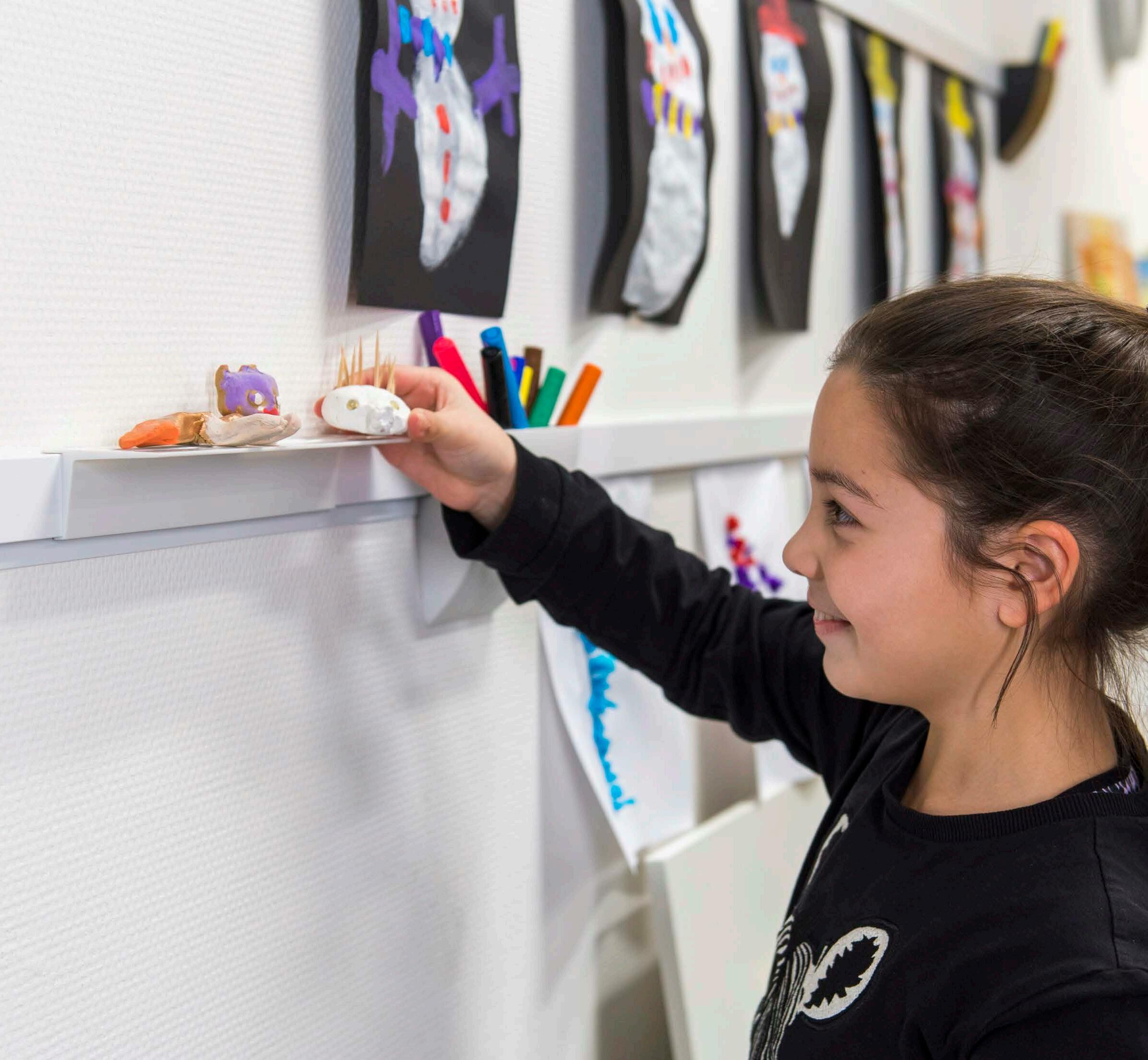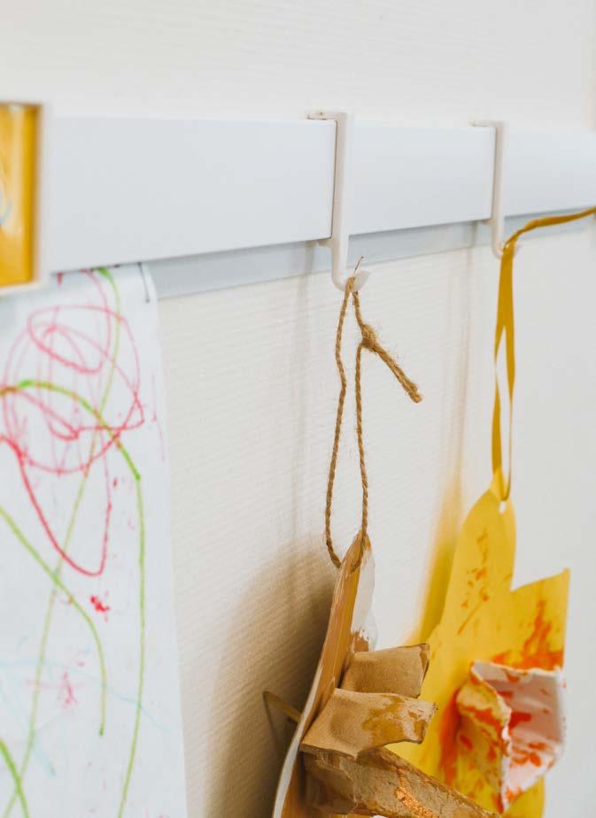 Op school wordt er heel wat getekend en geknutseld. Een zelf gemaakte spin of een kleurrijk bootje gemaakt van een oude wc-rol en ijsstokjes. Gemaakt rondom een bepaald seizoen of thema op school. Knutselwerkjes die pas tot hun recht komen wanneer deze aan een touwtje worden opgehangen. Met trots willen de kinderen ook deze mooie zelfgemaakte spulletjes aan iedereen laten zien. Maar waar hang je die op? De Clip Hanger is een klein haakje, in de kleuren wit en zwart, welke eenvoudig aan de Info Rail te bevestigen is. Met een simpele klik wordt de Clip Hanger aan de Info Rail bevestigd en kan het knutselwerkje opgehangen worden. In combinatie met de me-clip worden de werkjes van de kinderen op een leuke persoonlijke manier gepresenteerd. Een trots kind! We hebben de Info Rail zowel binnen als buiten de klas opgehangen. Binnen hebben we gekozen voor ‘kindhoogte’. Het systeem is zo makkelijk dat ze zelf hun werkjes snel en georganiseerd kunnen ophangen en tonen. Het werkt heel actief en alles ziet er netjes en kleurrijk uit. “ leerkracht Cor, Emousschool Den Haag